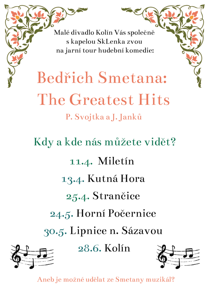 Tak konečně Vám můžeme představit naši jarní tour, kde společně s kapelou SkLenka představíme „všechny opery Bedřicha Smetany v jediném večeru“ … kdo nás zná, tak ví, že o zábavu zde nebude nouze a rozhodně nečekejte opery v klasickém slova smyslu ! 😀 Co naopak čekat můžete je spousta vtipných situací, nádhernou hudbu upravenou pro dnešní posluchače a nadšené divadelníky, kteří se na Vás budou těšit na každé zastávce naší tour ! 😉